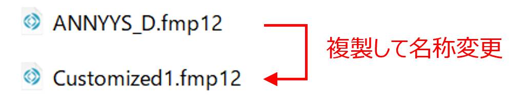 - 基本の電子カルテ本体「ANNYYS_D(.fmp12)」を複製し、ファイル名を仮に「Customized1(.fmp12)」と変更します。